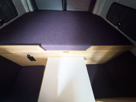 Custom-made mattress & cushions lined in a beautiful purple fabric